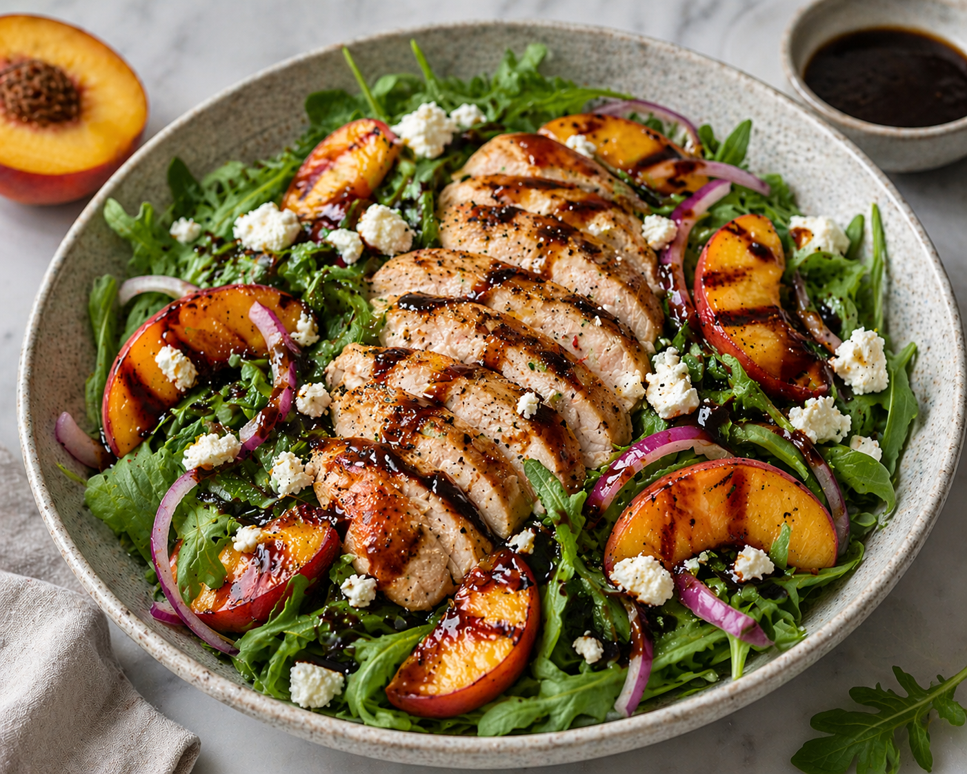 - Add warm grilled chicken and fresh peach slices