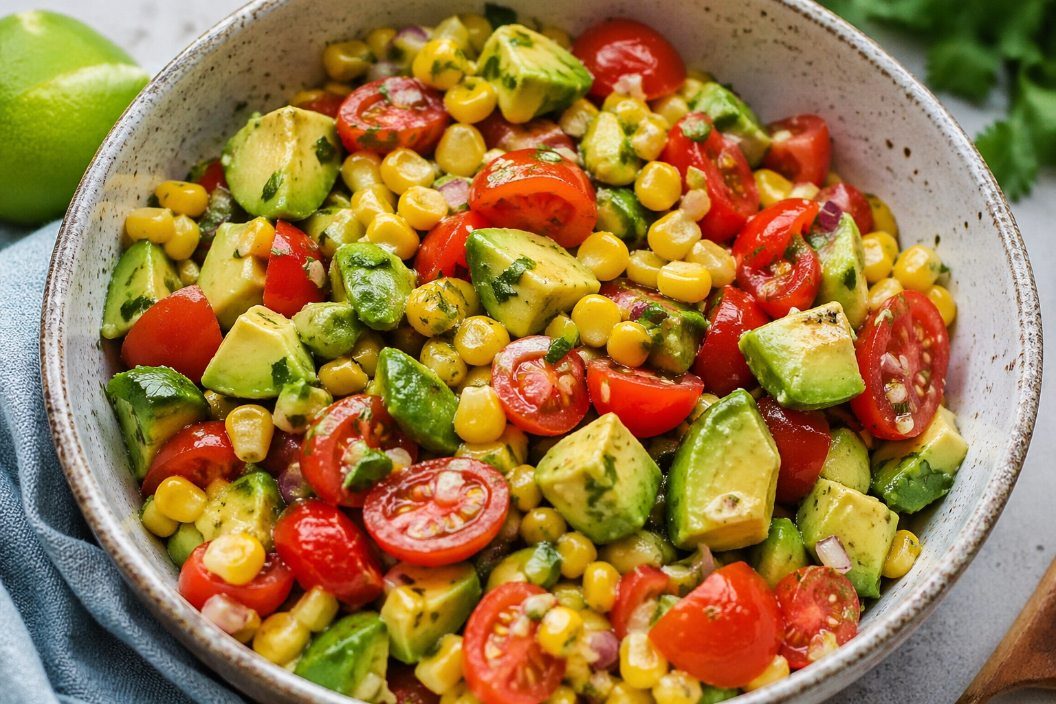 - Combine avocado, corn, and tomatoes