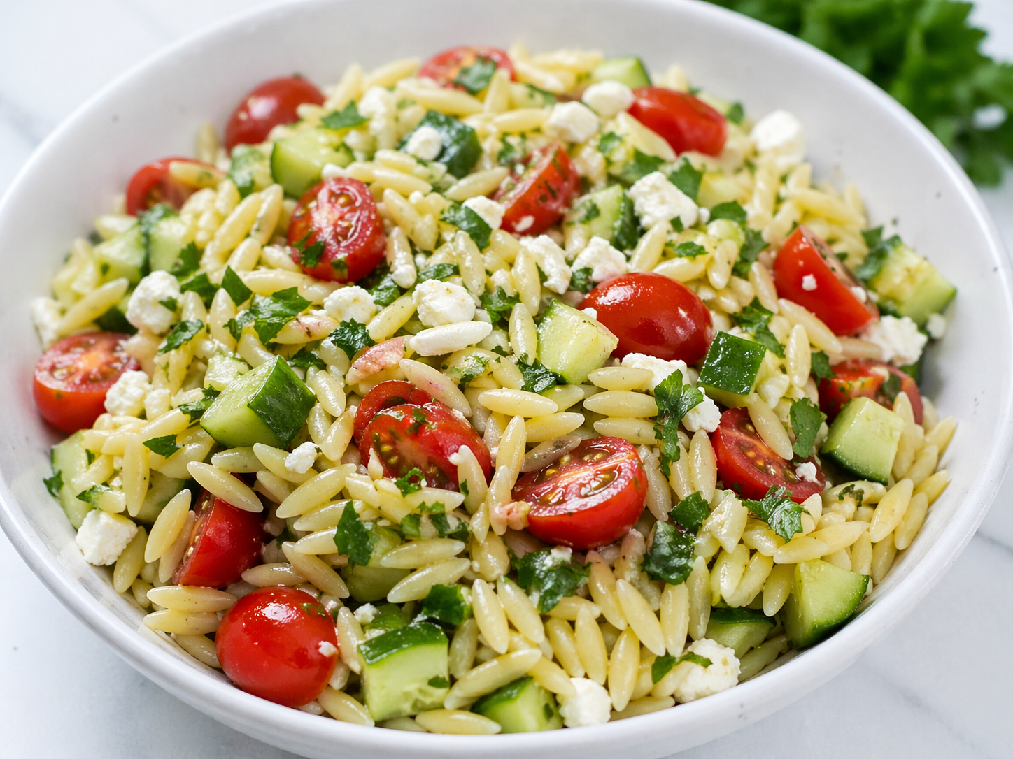 - Add orzo, cucumber, tomatoes, and feta to a bowl