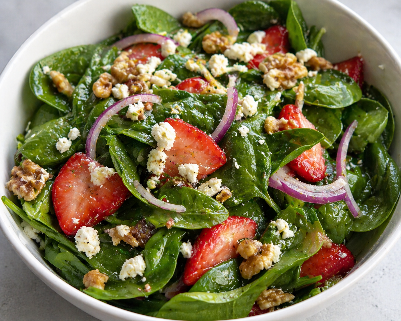 - Add spinach, strawberries, walnuts, onion, and feta to a bowl